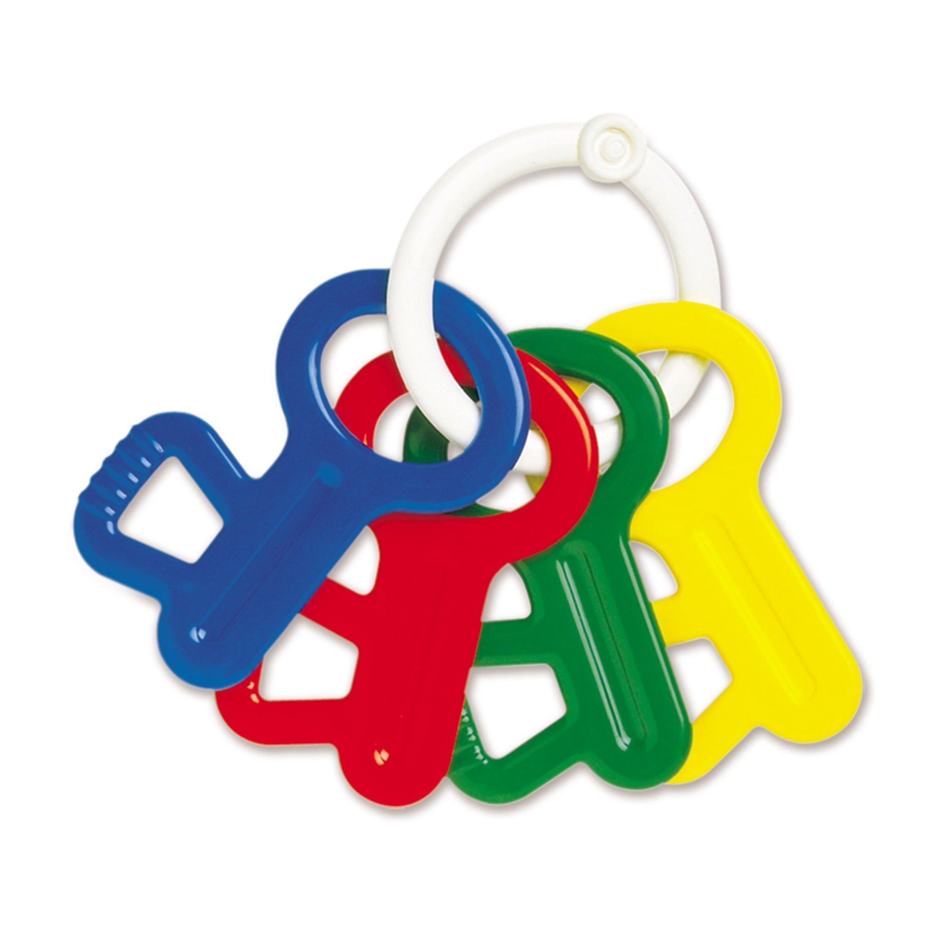 Four brightly coloured giant keys held together on a sturdy keyring for rattling and teething. Length 13.5cm