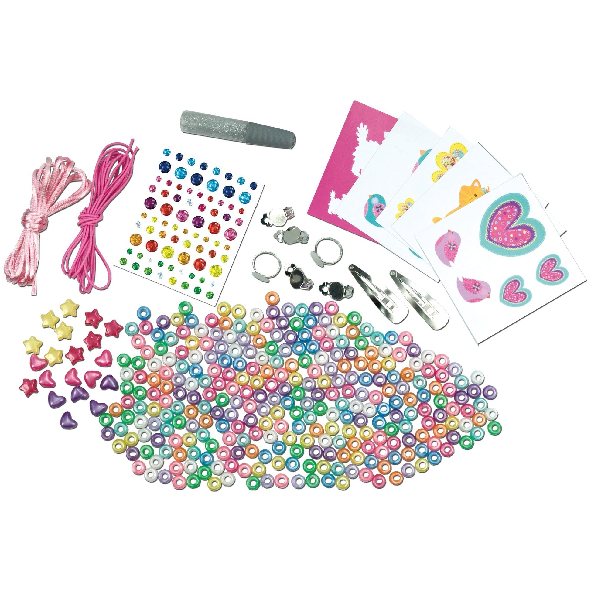 Make fun beaded bracelets and necklaces and decorate foam shapes with gems and glitter glue then mount on earrings, rings and hair clips to make cool jewellery. Contents: 300 pony beads, assorted foam shapes and beads, stick-on gems, 2 pairs of clip-on earrings, 2 rings, 2 hair clips, silky cord, elastic, sticky foam pads, glitter glue, guide.