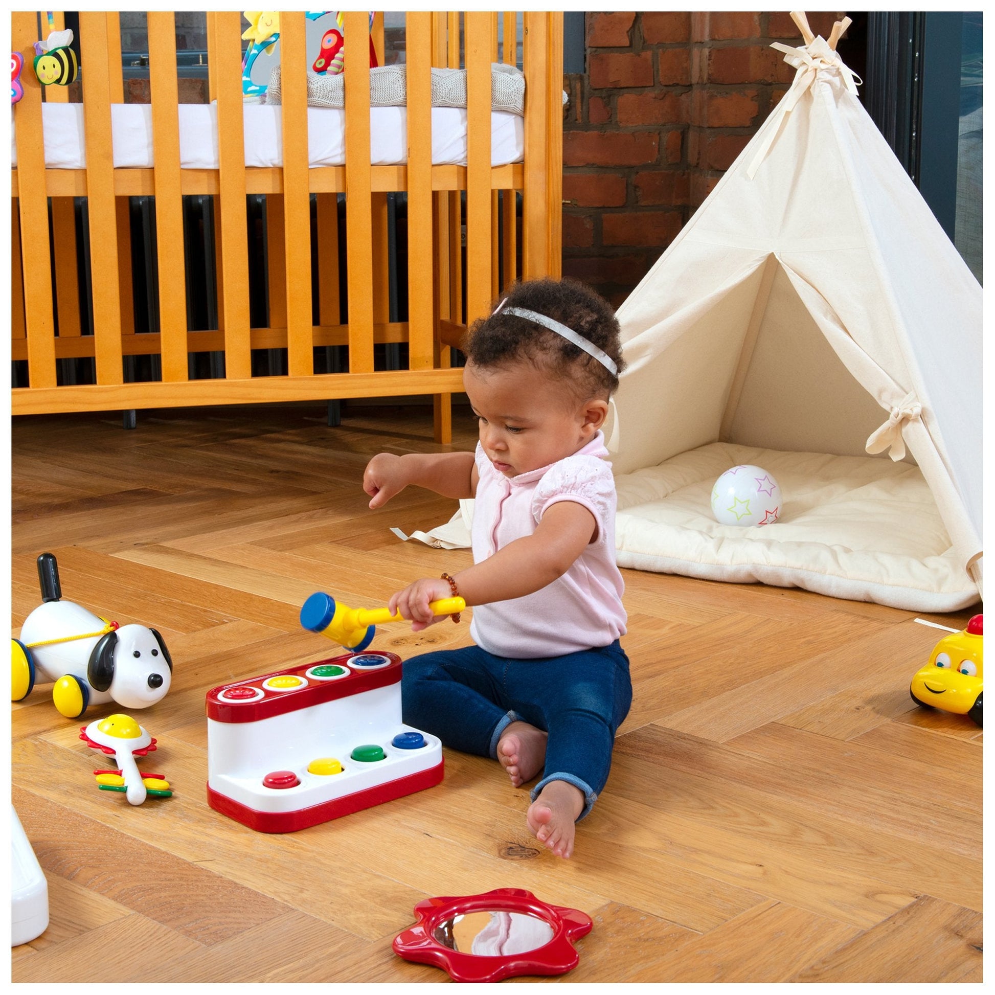 Tap a button with the hammer and the matching coloured pal pops up. Repeat the fun game of peep-o with the foursmiley pals. Helps develop hand-eye coordination and manual dexterity.